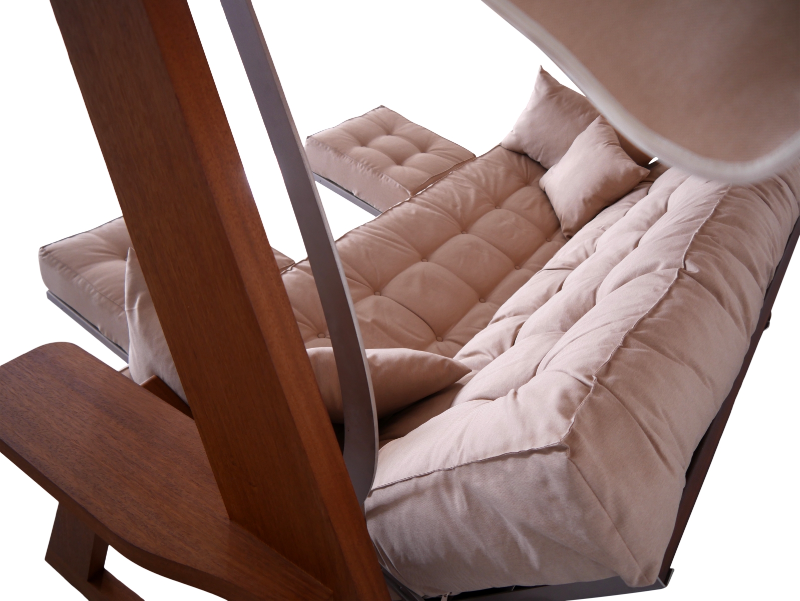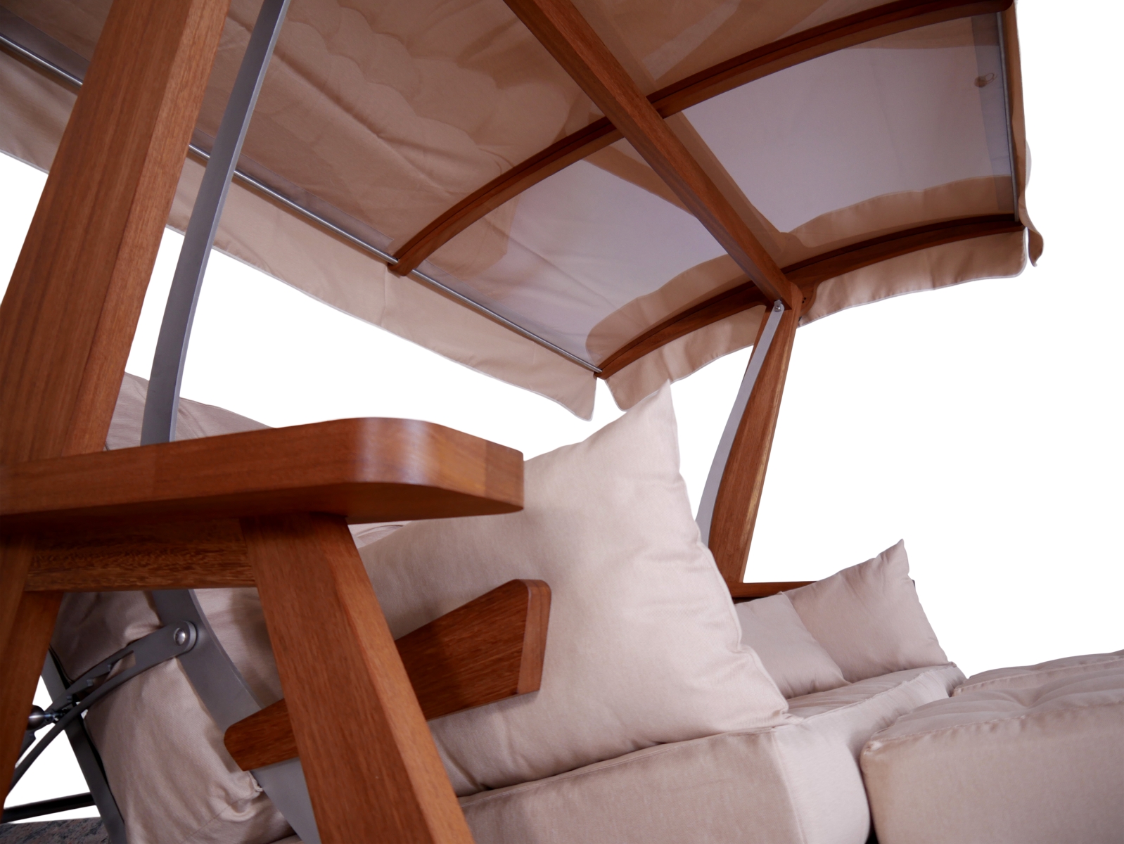 Um sehr bequemen Sitzkomfort zu erreichen, wurden 3 verschiedene Füllmaterialien für die einzelnen Polster und Kissen verwendet. Die Sitz- und Rückenpolster haben eine Stärke bis zu 25 cm. Alle Stoffe für Polster, Kissen, Dach und Schutzhülle bestehen aus einer hochwertigen Polyesterfaser. Die Stoffoberfläche hat einen angenehmen Griff und ist sehr witterungsbeständig.